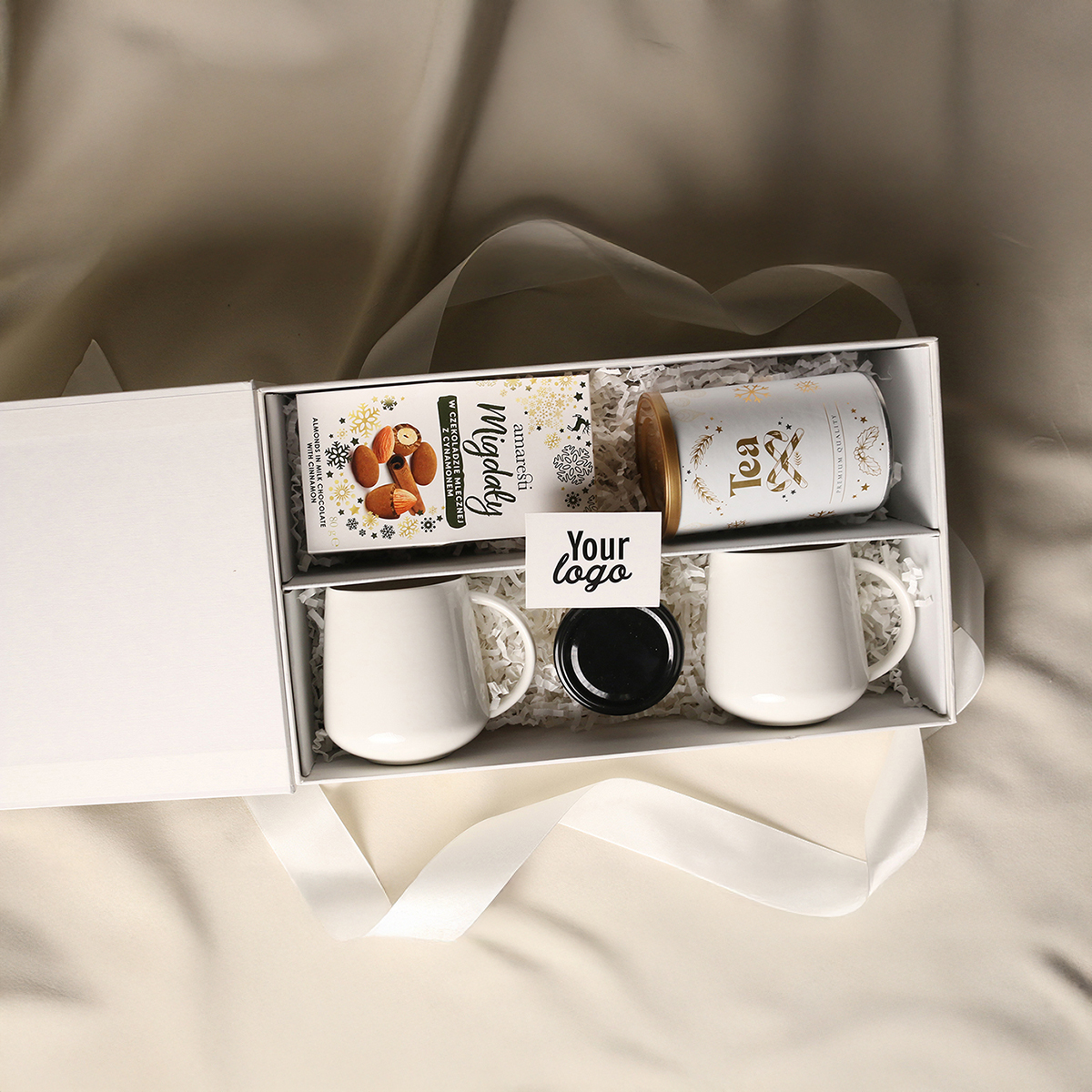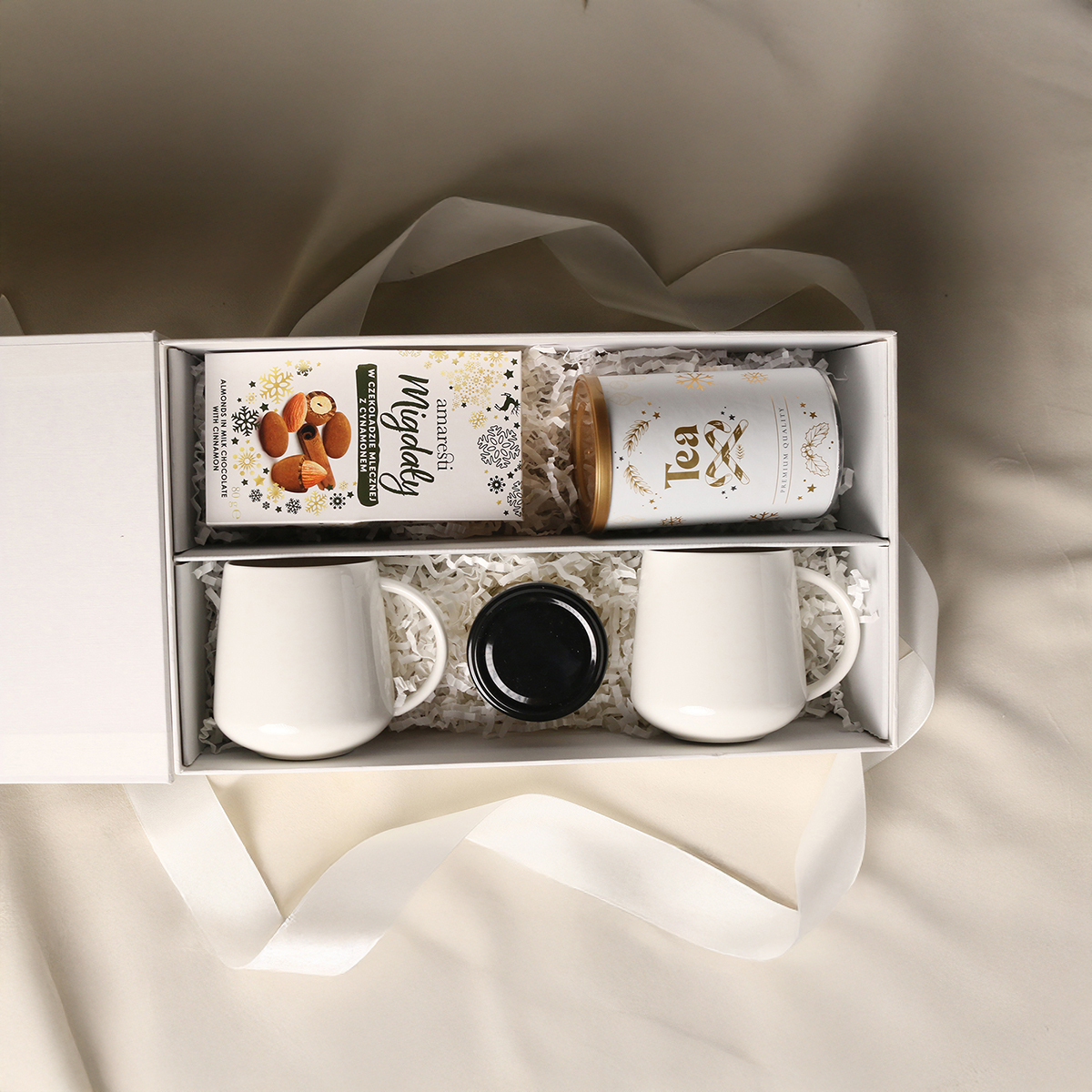 Eleganckie porcelanowe kubki Melody - 2 szt. Słodkie migdały w czekoladzie z cynamonem Aromatyczna herbata zielona Sencha z wiśniami, płatkami róży i liśćmi ginko biloba 80g Naturalny rzemieślniczy Miód wielokwiatowy 130g Ekskluzywne opakowanie zamykane na magnes z możliwością dodania pasującej wstążki i obwoluty