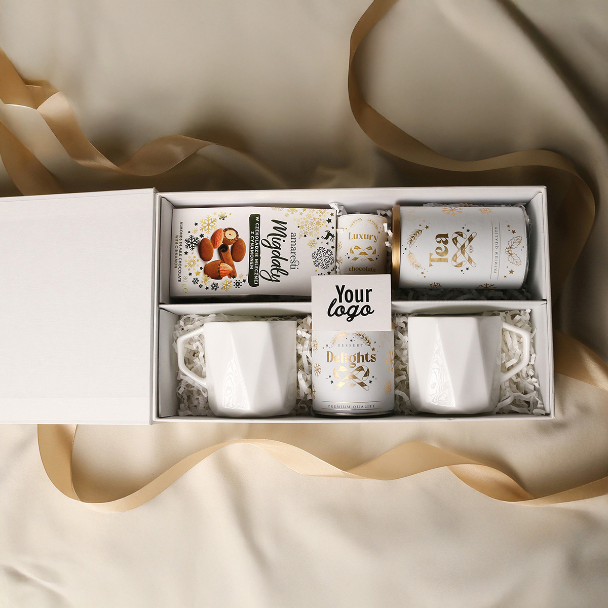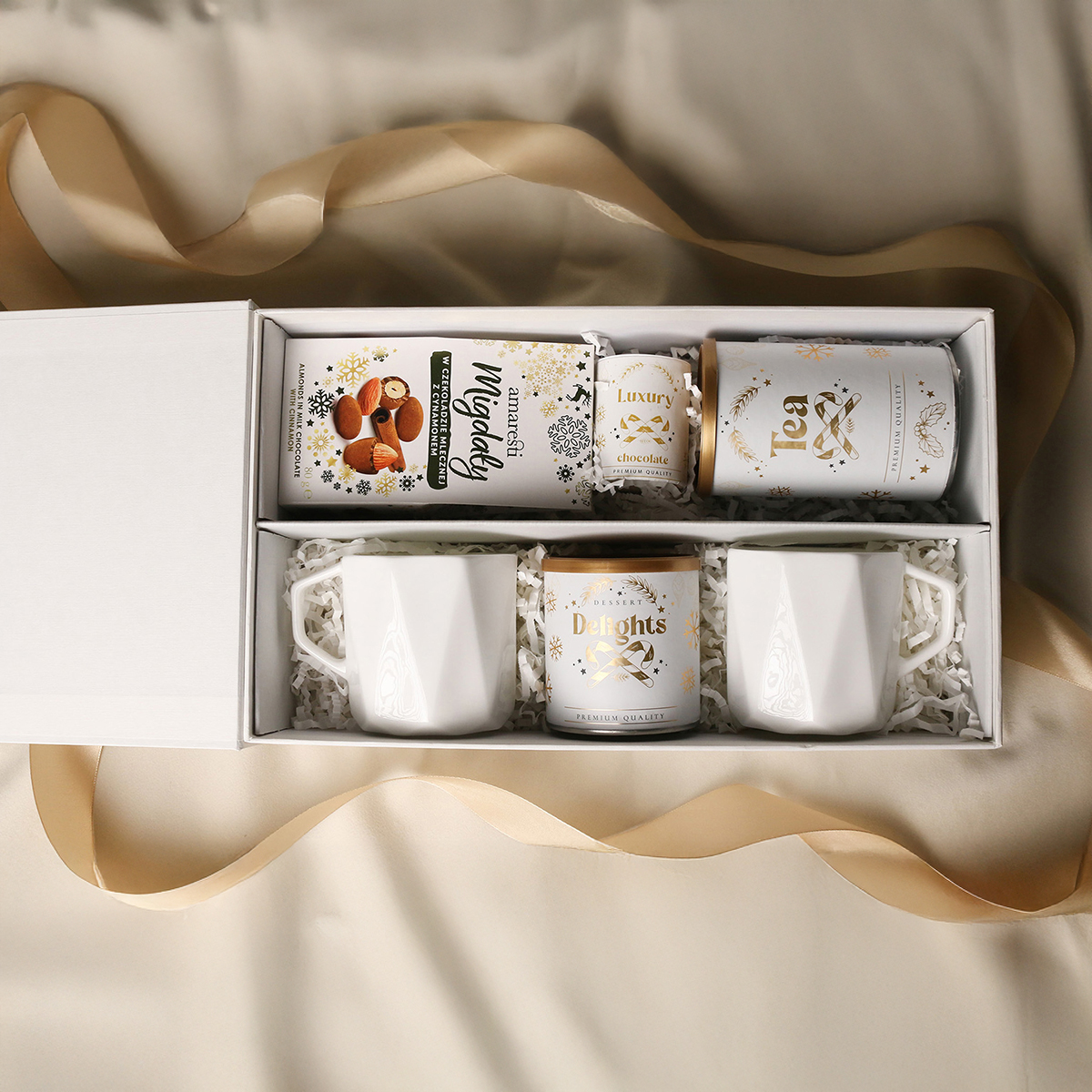 Ekskluzywne kubki z porcelany Fine Bone China - Crown - 2 szt. Słodkie migdały w czekoladzie z cynamonem Delikatne Delights Pralines - czarna porzeczka w białej czekoladzie w pudrze malinowym 80g Aromatyczna herbata zielona Sencha z wiśniami, płatkami róży i liśćmi ginko biloba 80g Ekskluzywne opakowanie zamykane na magnes z możliwością dodania pasującej wstążki i obwoluty